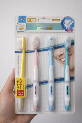 فرش أسنان عملية مصممة لتنظيف فعّال للأسنان واللثة، مع شعيرات ناعمة إلى متوسطة تساعد على إزالة البلاك وبقايا الطعام بلطف دون التسبب في تهيّج اللثة. العبوة الاقتصادية تحتوي على 3 فرش + 1 فرشة إضافية، ما يجعلها مثالية للاستخدام العائلي واليومي.