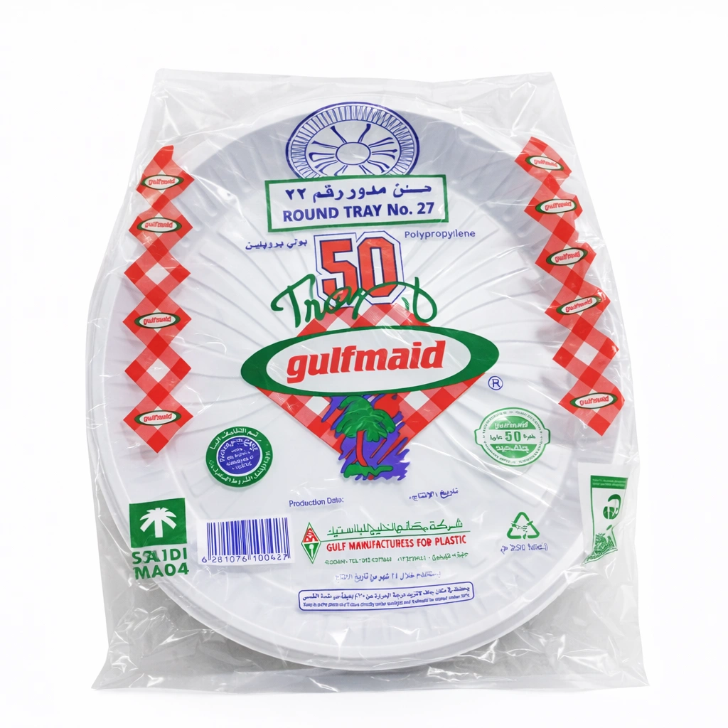 اختيار عملي ومناسب لتقديم الأطعمة في المناسبات والتجمعات مع Al Khaleej Round Plate صحن الخليج المدور رقم 22. يتميز بتصميم دائري واسع يوفر مساحة مناسبة لتقديم الوجبات، الأرز، المشويات، والحلويات، مع خامة بلاستيكية قوية تتحمل الاستخدام.