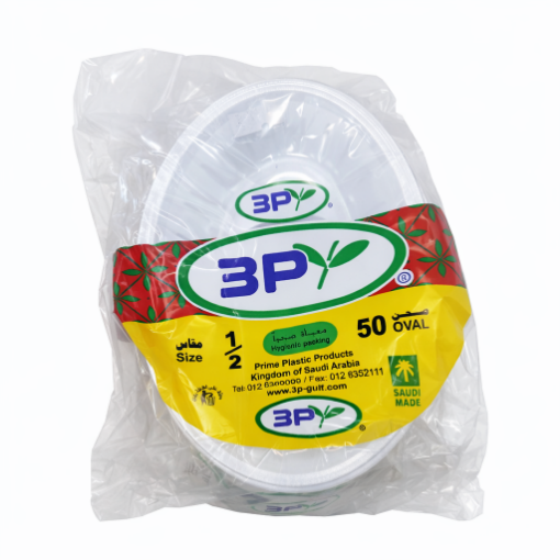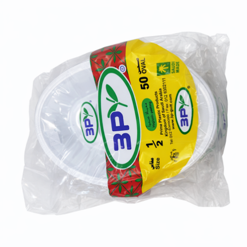 صحن بلاستيك بيضاوي مقاس 1/2 – ثري بي | عبوة 50 حبة × 30 ربطة